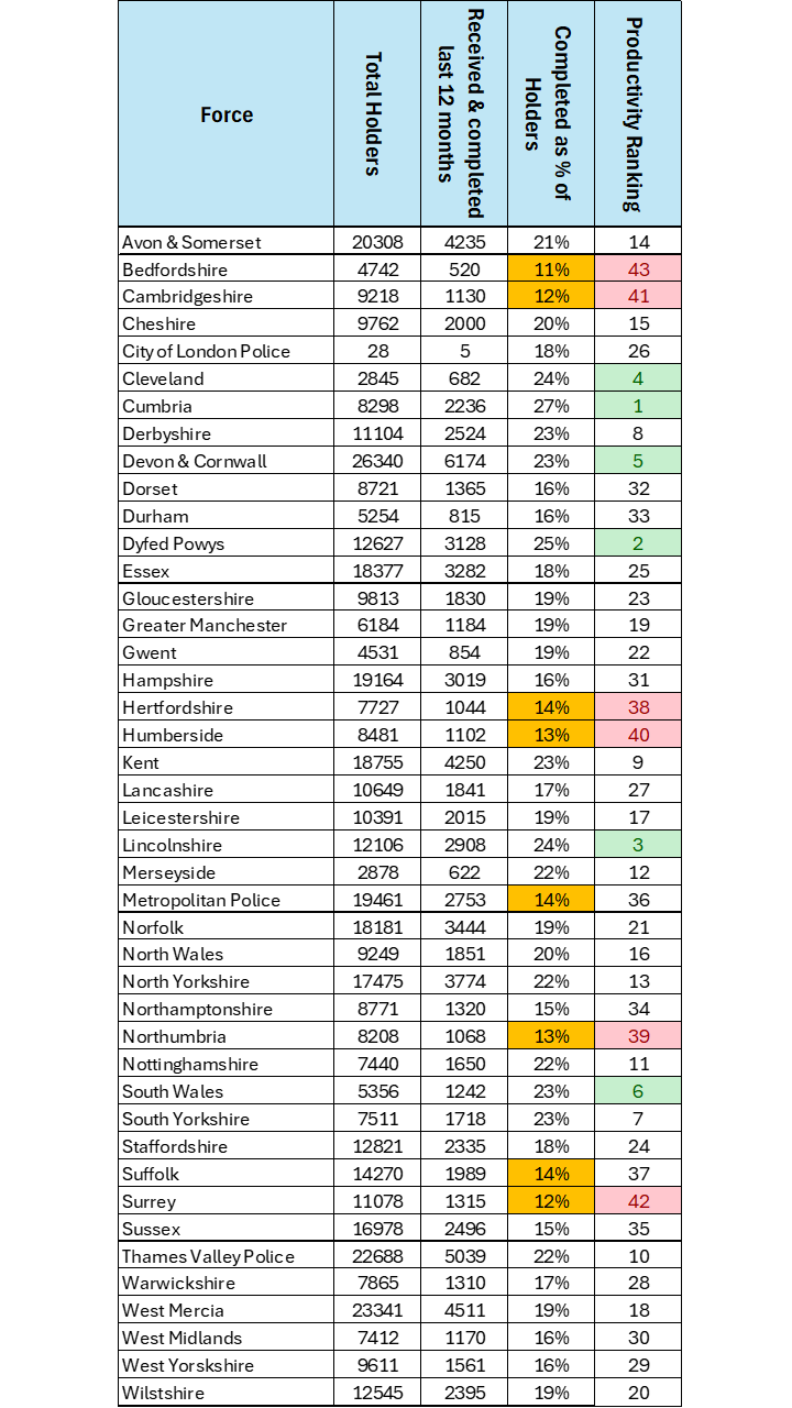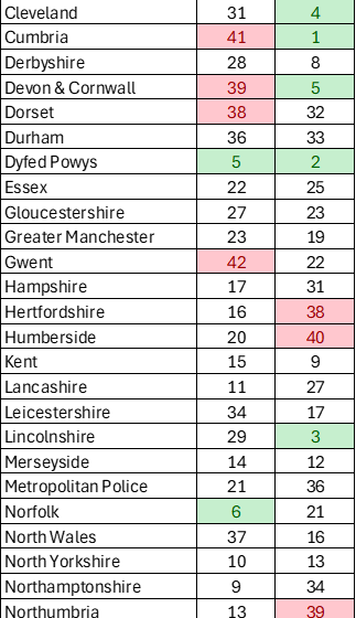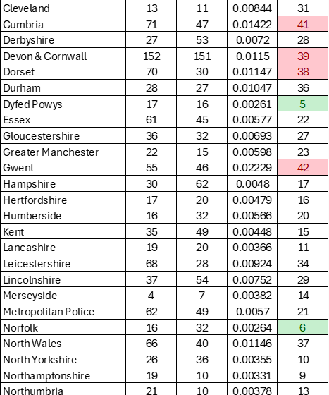 Using the approach detailed above I have ranked each force on this basis to enable comment on productivity and comparison between forces.