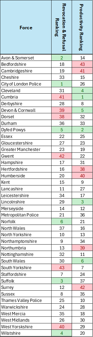 The following chart summarises my assessment of where each Force ranks according to Productivity and Revocation & Refusals. If this does not display on your mobile device please open it via the gallery below.
