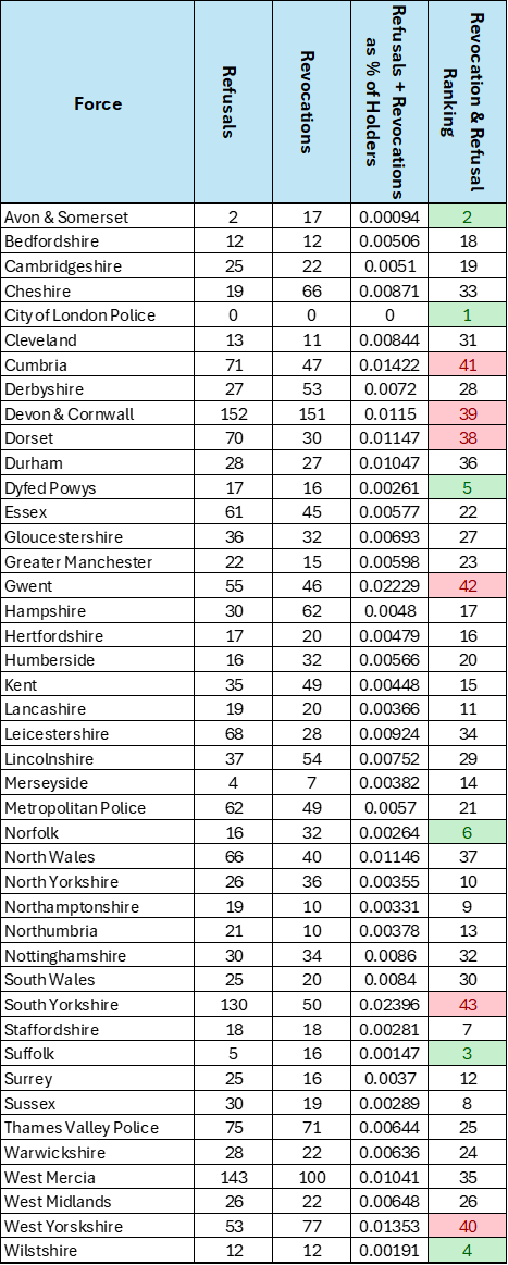 To give some clearer idea of individual forces approach in this area I have added together the number of revocations and refusals issued in a yearly period and divided this by the total number of certificate holders. This gives a percentage that we can use to rank forces and give a clearer idea of what is going on in this area.